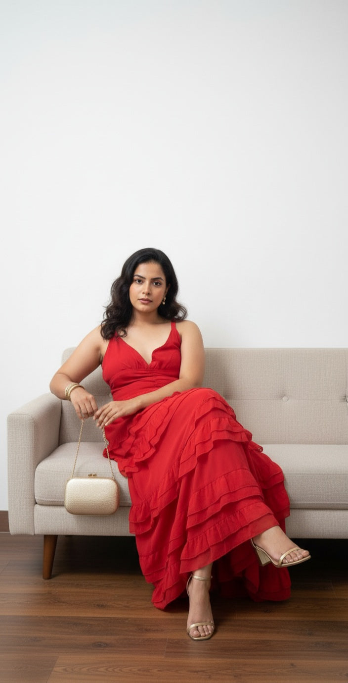 This dress features a graceful ruffled hem that adds movement and dimension, creating a sophisticated graceful look. Crafted with attention to detail, it ensures a comfortable yet flattering fit suitable for formal occasions or stylish gatherings. Its flowing length and rich texture make it a versatile choice for a timeless look.