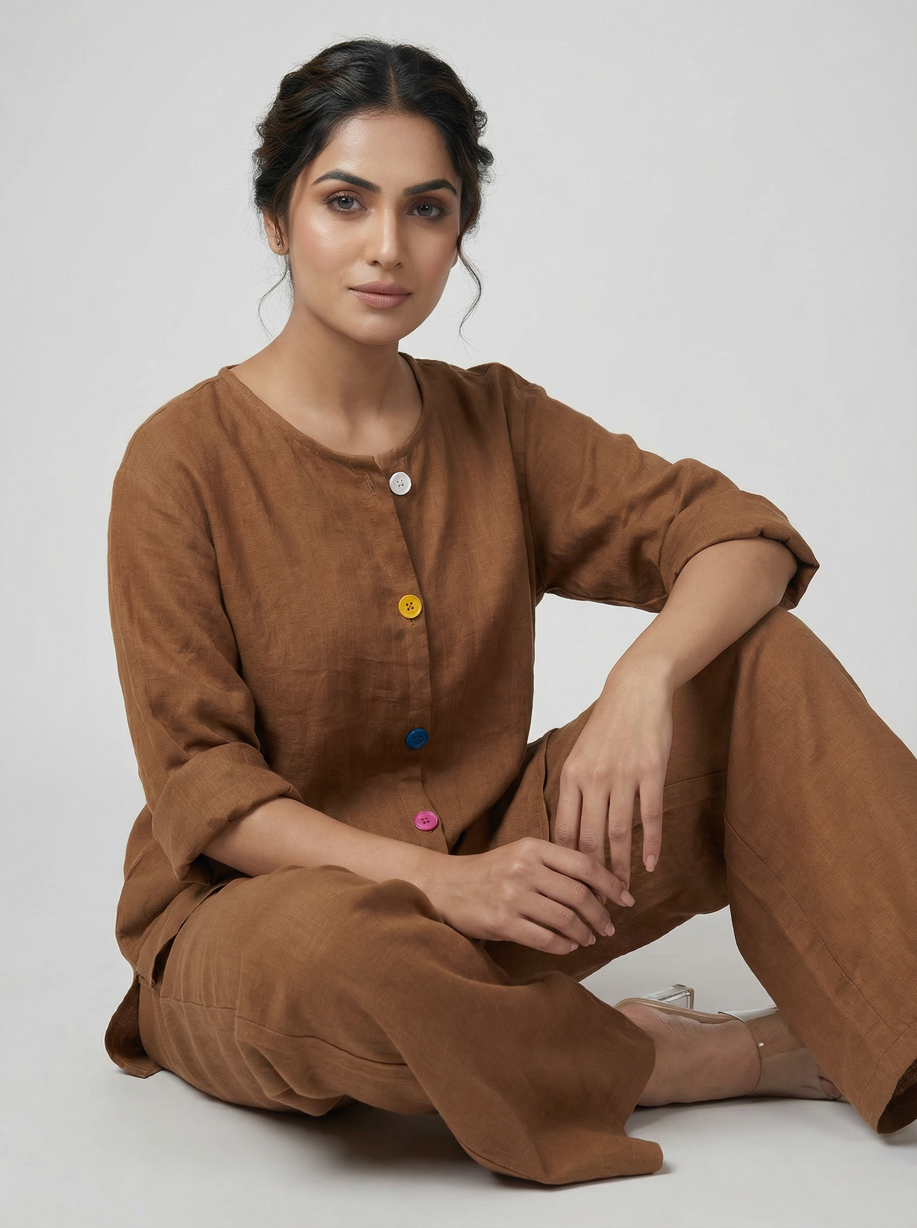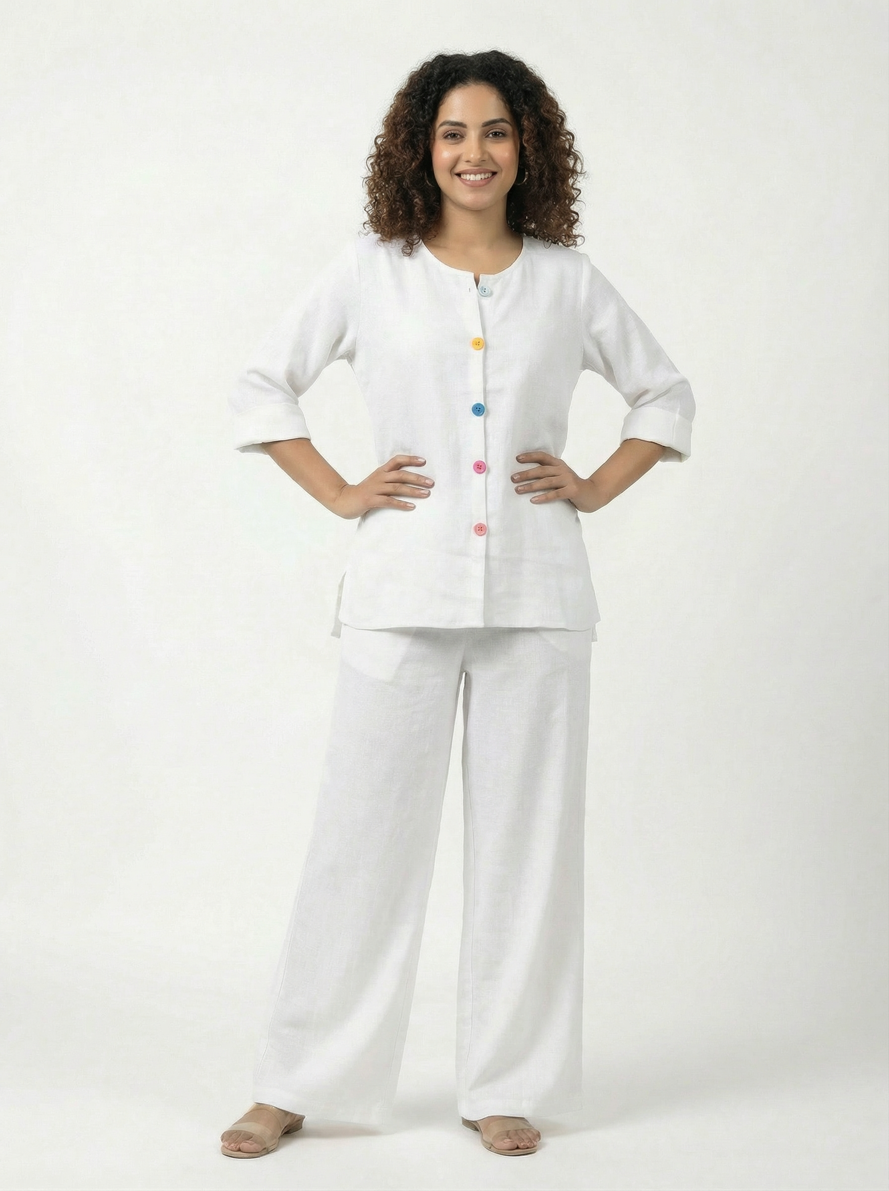This set offers lightweight comfort with breathable mul mul cotton fabric, ideal for warm weather. Featuring vibrant multicolor buttons, it adds a subtle yet stylish accent to the coordinated pieces. Perfectly suited for casual and semi-formal occasions. Durable and soft, it ensures lasting comfort throughout the day.