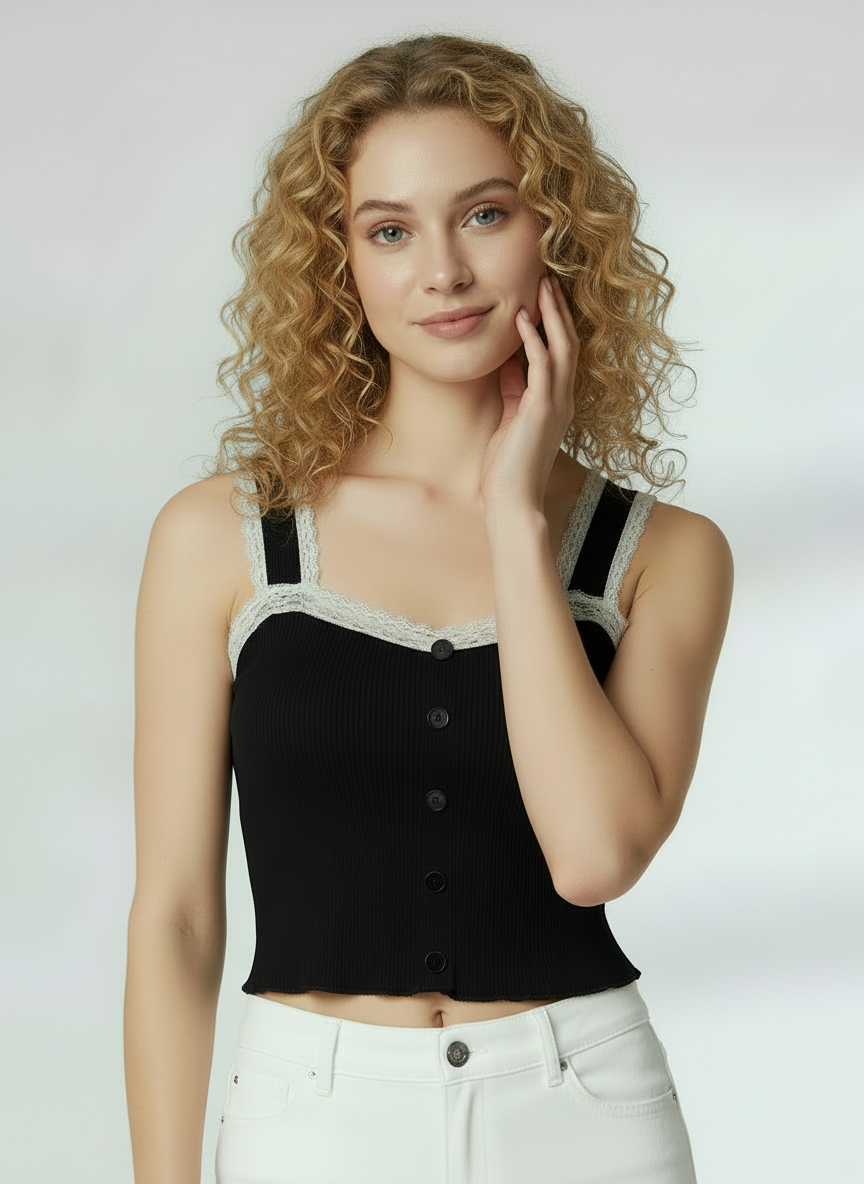 Featuring an elegant lace neckline that adds a delicate, refined touch. Designed for a flattering fit, this top combines style with comfort, making it ideal for both casual outings and special occasions. The intricate lace detail offers a graceful yet contemporary look. Perfect for pairing with high-waisted bottoms, it melds timeless charm with modern fashion sensibilities.